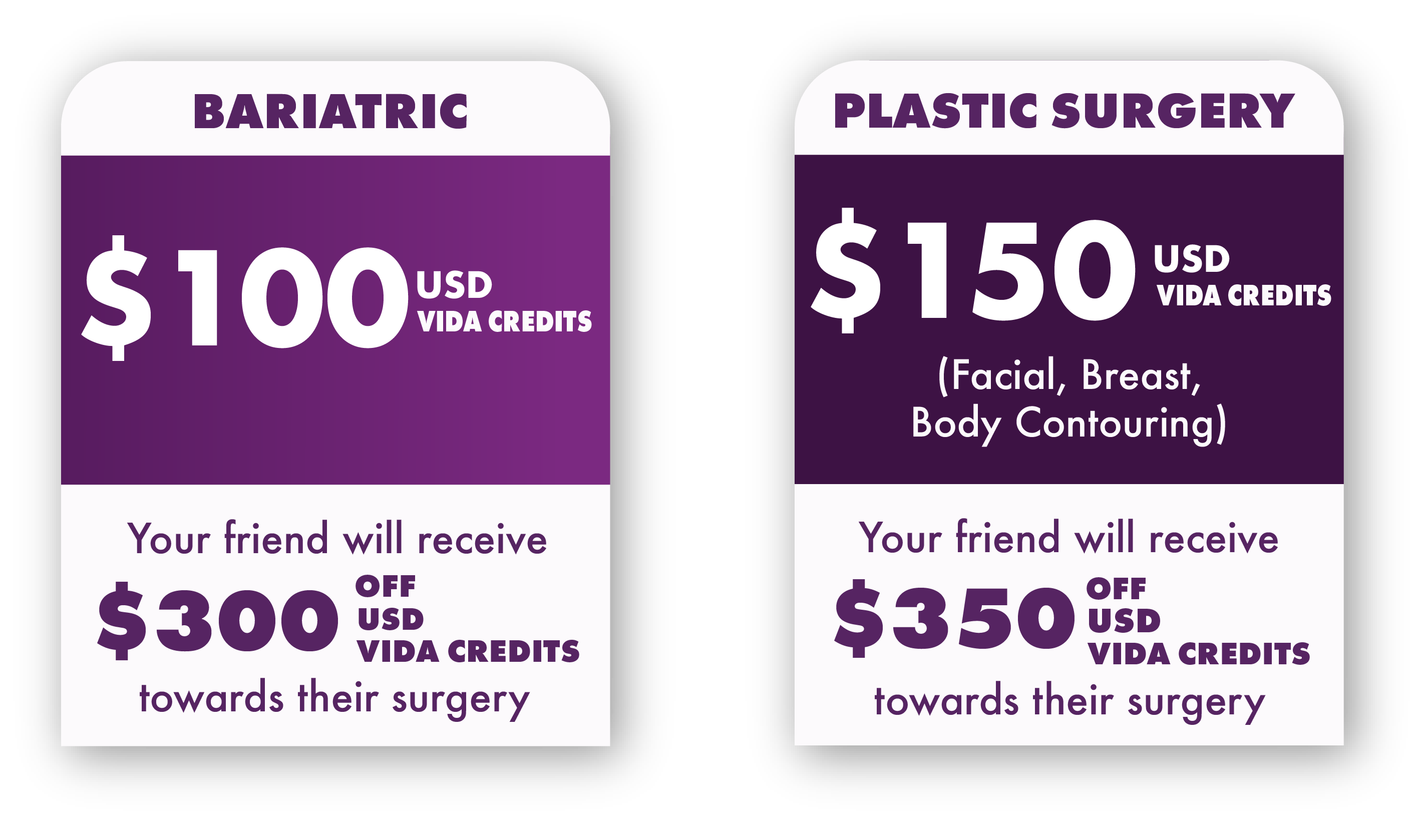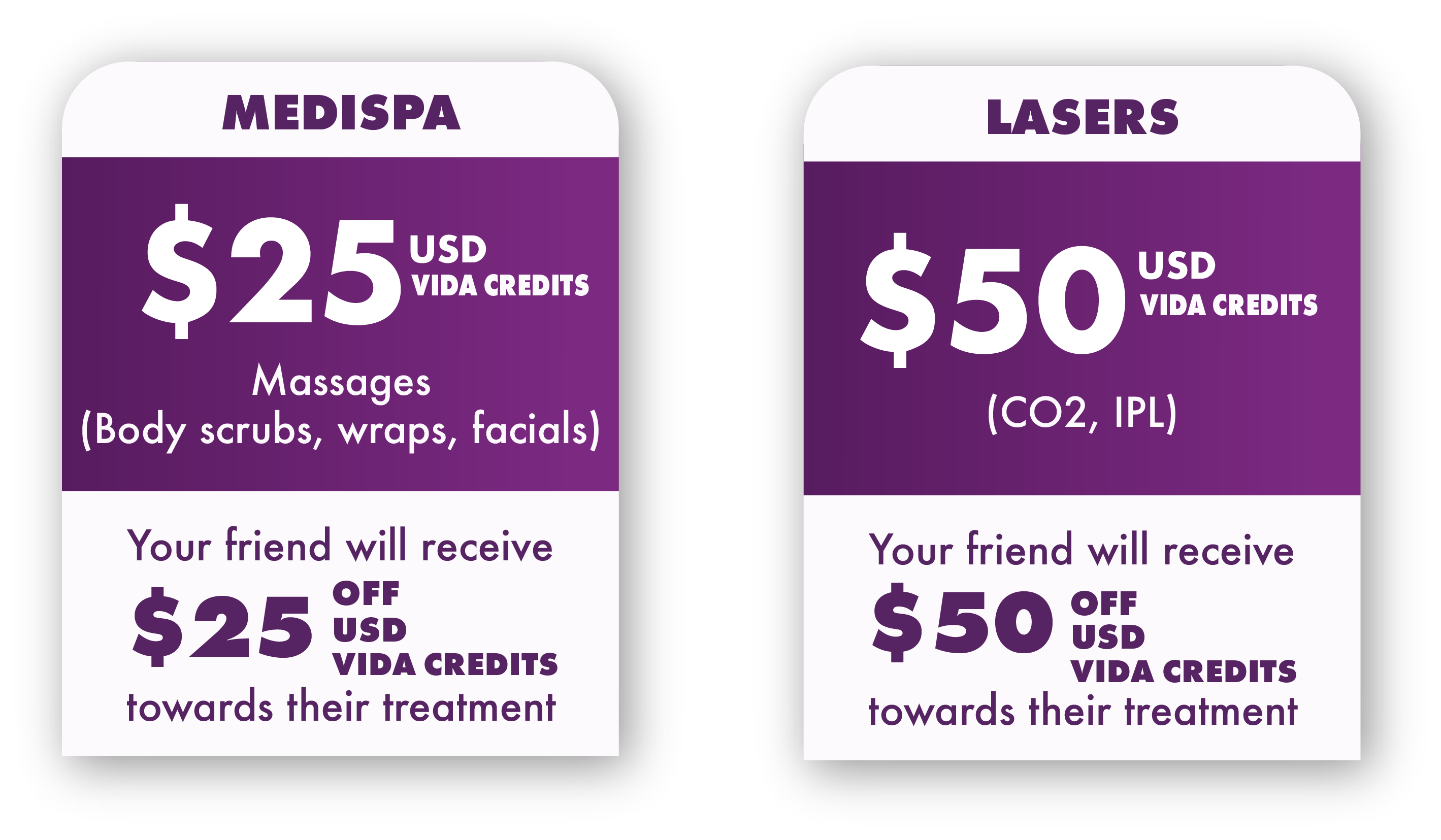 *1 Vida Credit is equivalent to 1 usd dollar and can only be transferred at Vida Wellness And Beauty facilities for procedures and services participating in the referral plan